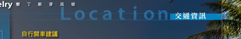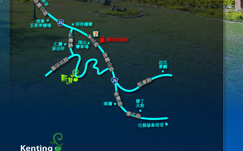中山高(國道1號)到終點站者 南下開車走中山高(國道1號)到終點站者,左轉接台17線往墾丁方向經小港機場 → 林園 → 東港 → 林邊 → 佳冬 → 水底寮 → 台1線 → 楓港 → 台26線 → 車城鄉,經台26線南下 22.5公里處 → 第一個路口右轉,即可沿指標找到新芽囉。