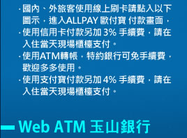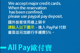 1.進房(Check in):下午03:00以後,退房(Check oue):上午11:00以前。
